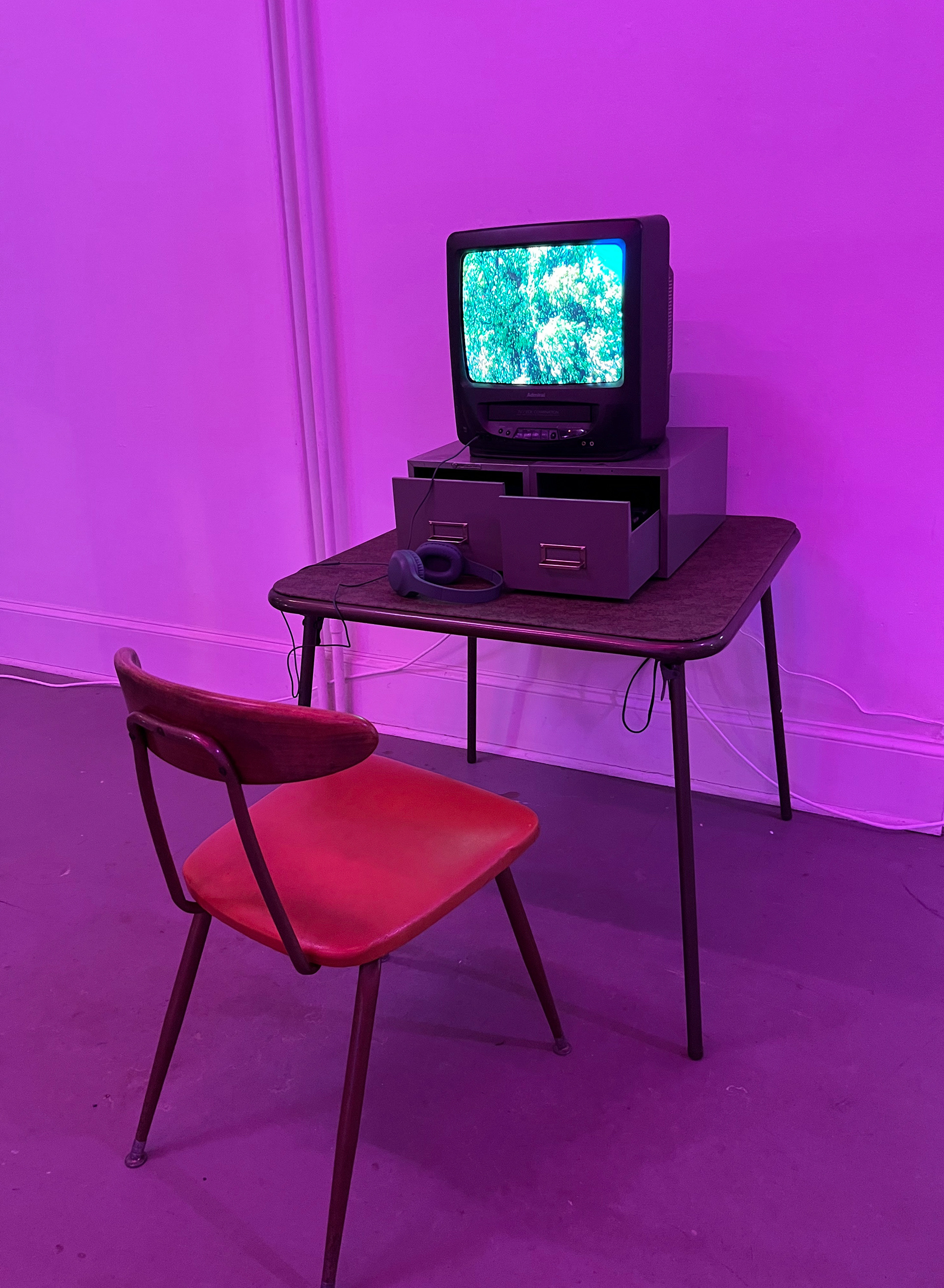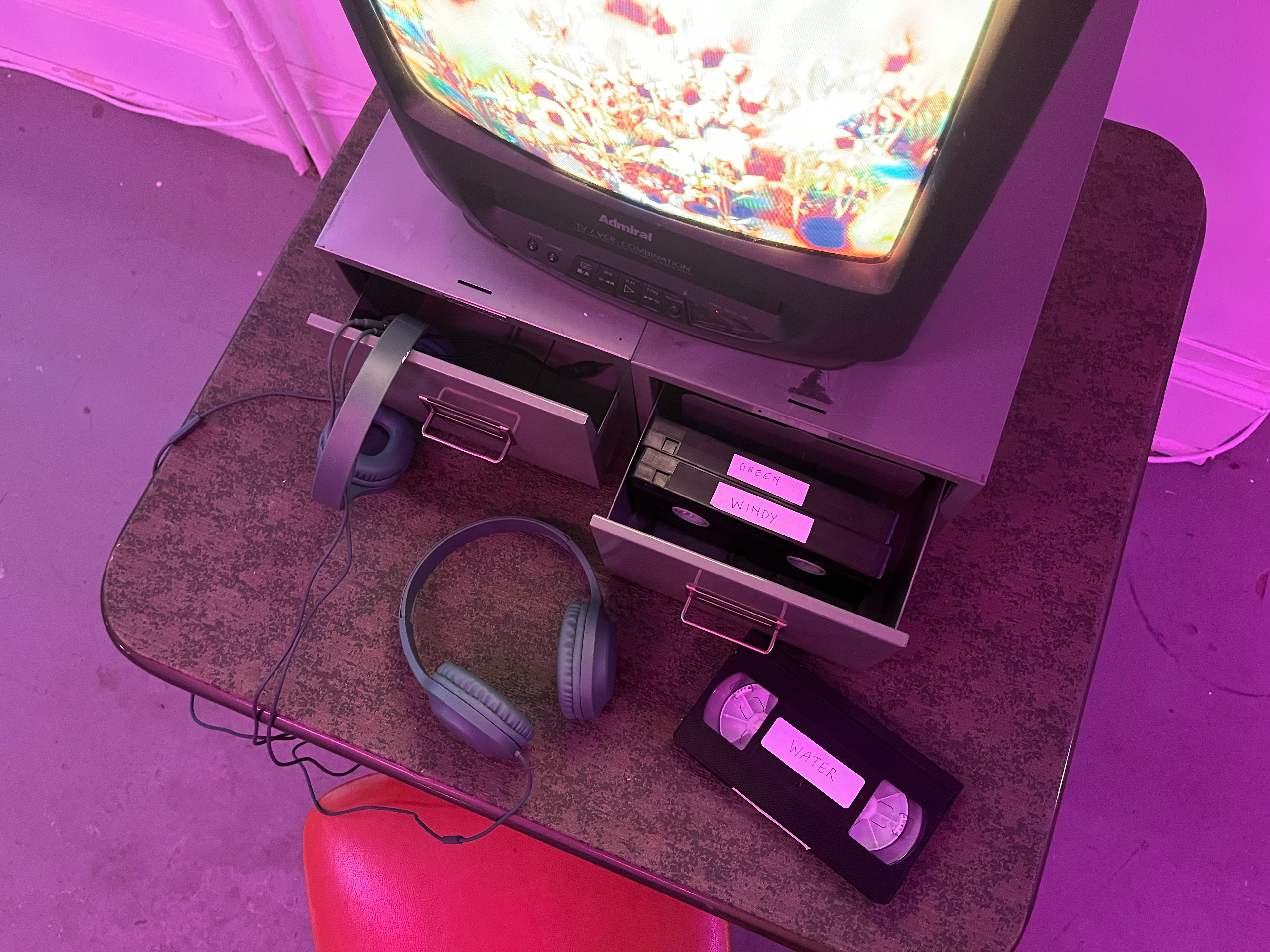 Love Letter to Flowers takes the form of a small VHS library, where participants select tapes containing original video and sound compositions focused on flowers, clouds, and natural elements. Seated at a vintage television with headphones, viewers engage with the work through quiet, deliberate choice. The piece emphasizes intimacy, nostalgia, and focused attention.